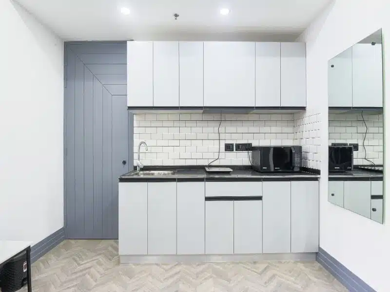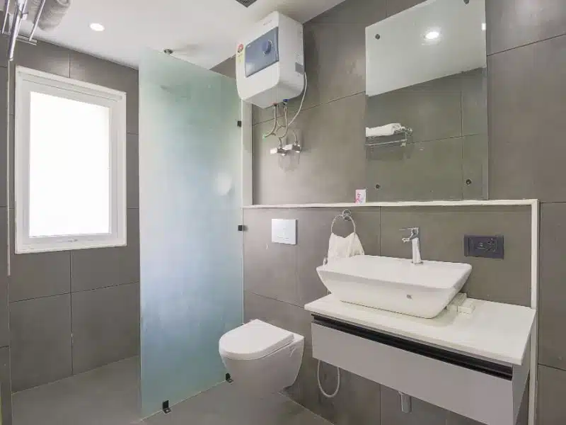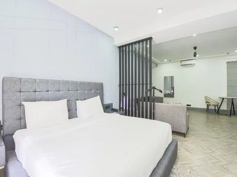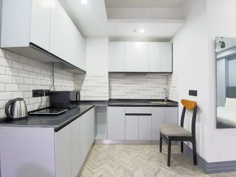 The Furnished Serviced Apartments Near DLF Cyber City Gurgaon are bigger in size with King Size Bed and come with attached bathroom, work desk, separate living area with a 2-3 seater couches and a fully loaded Kitchen with cooking facility including refrigerator, microwave, sandwich maker, electric kettle and toaster.